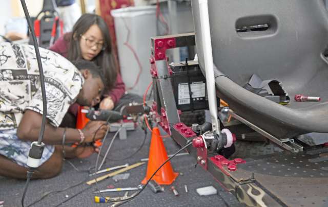 Members of the Team Cardi 'pit crew' prepare their personal electric vehicle for the upcoming race. (Photo by Adam Zewe/SEAS Communications.)