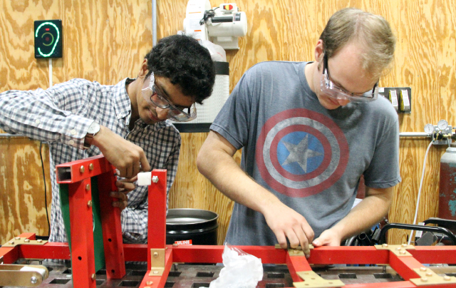 Computer science concentrator Harshal Singh, A.B. ’20 (left) and mechanical engineering concentrator Tony Turner, S.B. '19, work on their vehicle's chassis at the Autodesk BUILD Space in Boston. (Photo by Adam Zewe/SEAS Communications.)