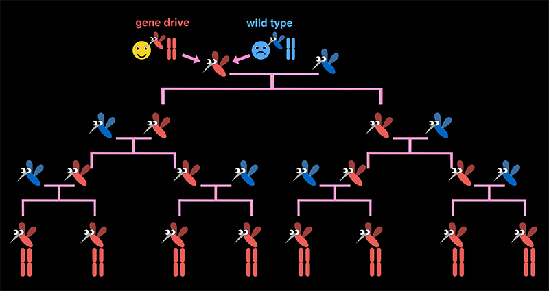 In the normal course of evolution, any specific trait has only a modest chance of being inherited by offspring. But, with the development of the CRISPR-Cas9 gene editing system, researchers can now design systems that increase the likelihood of inheritance of a desired trait to nearly 100 percent, even if that trait confers a selective disadvantage. These so-called gene drives could replace wild-type genes in short generations.