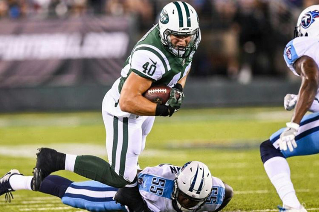 Applied math concentrator Anthony Firkser, A.B. '17, was signed by the New York Jets and played fullback during training camp and preseason. (Photo provided by Anthony Firkser.)