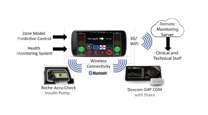 Schematic showing components of the closed-loop system. The insulin pump and Dexcom G4 Share AP CGM receiver with 505 algorithm were connected wirelessly via bluetooth to the Diabetes Assistant (DiAs) smartphone device. The Zone Model Predictive Control Artificial Pancreas algorithm ran on the DiAs. (Illustration courtesy of the Doyle Group, Harvard SEAS)