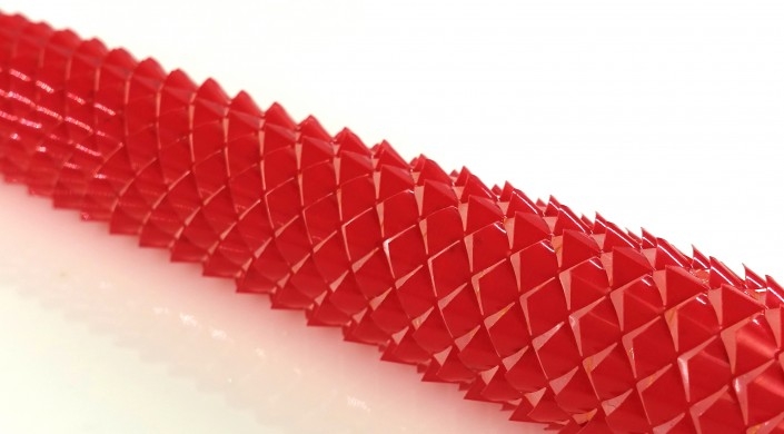 This soft robot is made using kirigami — an ancient Japanese paper craft that relies on cuts, rather than origami folds, to change the properties of a material. As the robot stretches, the kirigami is transformed into a 3D-textured surface, which grips the ground just like snake skin. (Image courtesy of Ahmad Rafsanjani/Harvard SEAS)