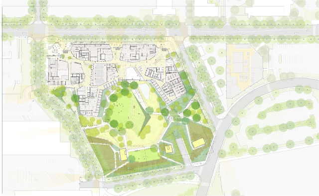 The SEC will feature 70,000 square feet of public greenery, and will serve as an anchor for the Allston Greenway, a 10-acre park. (Image courtesy of Behnisch Architekten)