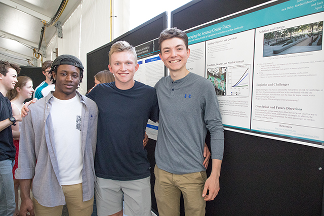 Freshmen (from left) Cecil Myers, Jack Swisher, and Jack Daley studied the costs and benefits of planting trees around Harvard's Science Center Plaza. (Photo by Eliza Grinnell/SEAS Communications.)