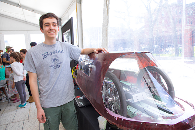 Freshman Joseph Sanchez displays the ultra-efficient vehicle built by the SEAS Racing Team. (Photo by Eliza Grinnell/SEAS Communications.)