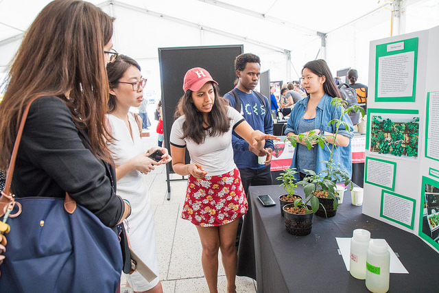 Environmental science and engineering concentrator Leticia Ortega, S.B. '19, discusses her team's hydroponic aquaponic water filtration system. (Photo by Eliza Grinnell/SEAS Communications.)