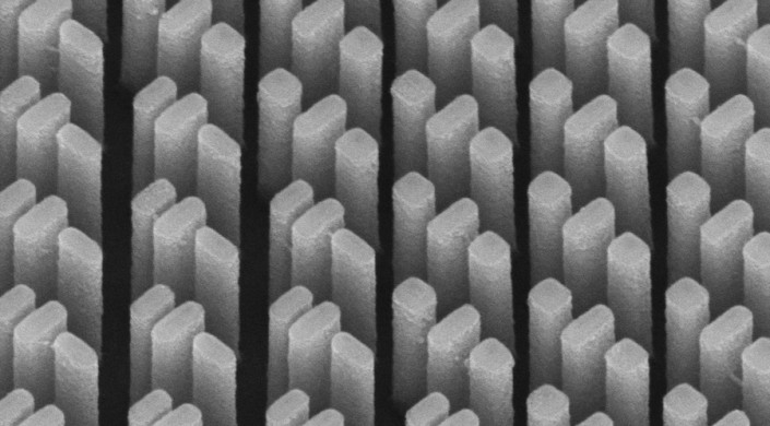 An SEM image of the metacorrector. The refractive index of each nanopillar can be tuned and controlled so that all wavelengths are brought to the same focal point. (Image courtesy of Harvard SEAS).