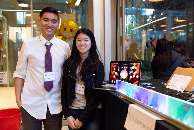 Statistics concentrator Caleb Ren, A.B. '21, and computer science concentrator Anna Wang, A.B. '22, created a device that uses color to visualize an individual's mood. (Photo by Richard Tong/Harvard SEAS)