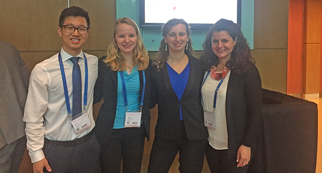 Students Do Hyun Kim, Olga Romanova, and Emily Dahl, with Irini Albanti, director of the Global Health Initiative at Dana-Farber/Boston Children's Cancer and Blood Disorders Center, at the World Cancer Congress.