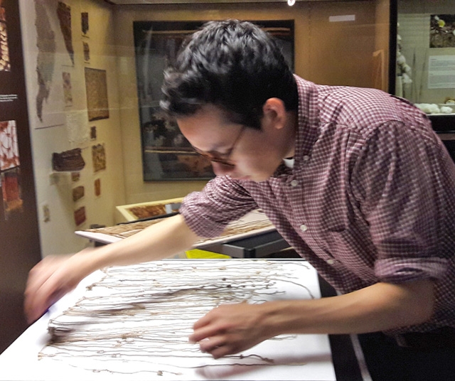Medrano studies a khipu at the Lippisches Landesmuseum during a research trip to Detmold, Germany. (Photo courtesy of Manny Medrano.)