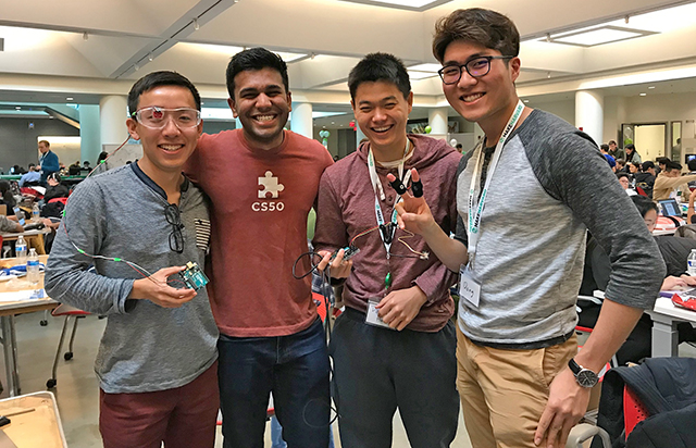 (From left) Andrew Yang, S.B. ’20, a bioengineering concentrator, Rohan Jha, S.B. ’20, a bioengineering concentrator, Darrell Huang, S.B. ’20, an electrical engineering concentrator, and Dong Hur, A.B. ’20, a neurobiology concentrator