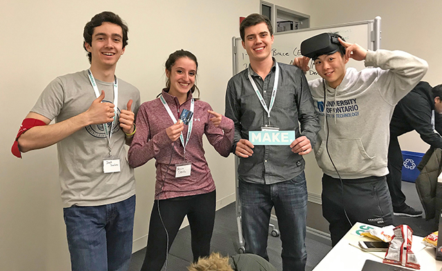 (From left) Joseph Sanchez, S.B. ’21, a mechanical engineering concentrator, Jessica DeVilla, S.B. ’21, a bioengineering engineering concentrator, Patrick Poplawski, S.B. ’19, a manufacturing engineering major at University of Ontario, and Manikin Ho, S.B. ’19, a mechatronics engineering at University of Ontario
