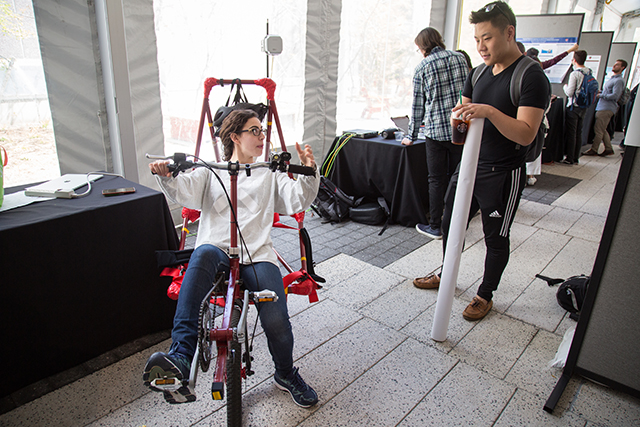 Human Powered Vehicle Team member Andrea Rodriguez-Marin Freudman, S.B. ‘20, demonstrates the recumbent bicycle to a curious Design and Project Fair attendee. (Photo by Annie Schugart/SEAS Communications)