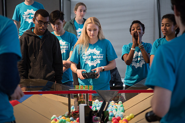 The students of Computer-Aided Machine Design (ES 51) participated in Turf Wars, where each team’s robot competed to get the greatest number of balls over a wall. Different teams embraced different designs. There were robots that scooped up the balls to launch them over the wall, forklifted the balls up against the wall, and gathered the balls to dump them over in bulk.