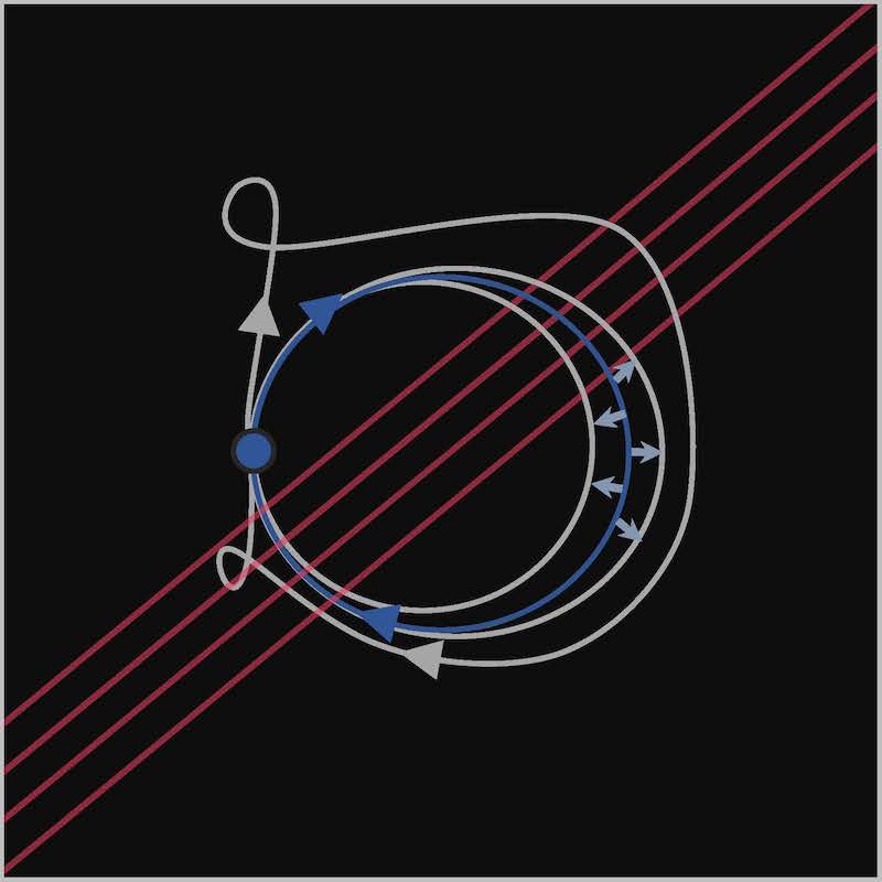 The modes of an optical frequency comb (red lines) are locked together by a variational principle. This principle defines a specific path (blue line) in the vast parameter space of the laser, which is preferred to any other path (grey lines) obtained by small variations of this trajectory. In obeying this variational principle, the laser guarantees to maximize its output power. (Image courtesy of the Capasso Lab/Harvard SEAS)